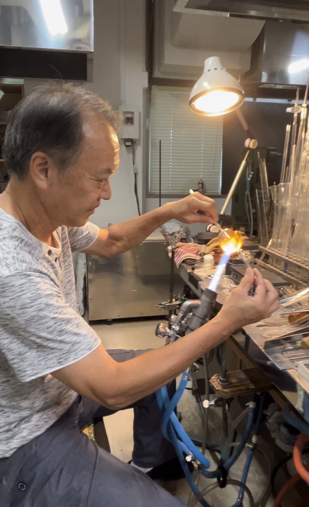 私は、音と物質をつなぐものとして、泡とその破裂に興味を持ちつづけてきた。物体-その破裂-破裂音という直列的な関係を捉え直すことで、冒頭で述べたスコアや数という問題に繋がるのではないかと考えている。その関心のもとで、オランダ伝承とも、中国伝承とも言われるガラス製の玩具に関するリサーチをおこなった。息を吹き込むと、底面のごく薄いガラスが膜振動をすることで、独特の破裂音を生み出す。本プロジェクトで対象となっているunearthにおいても、その他の私の作品にとっても泡とその破裂、その数は重要なテーマになっている。ぽっぴんの構造を、自身の作品に取り込むことはできないかと考え、東京の風鈴工房(かつて、ぽっぴんの製造も行っていた)と秋田大学に併設される実験器具専門のガラス工房をリサーチした。秋田大学では東京の職人が作ったぽっぴんを見てもらい、より大きなサイズで作るためにどのように製造すればよいかなどのアドバイスをいただいた。