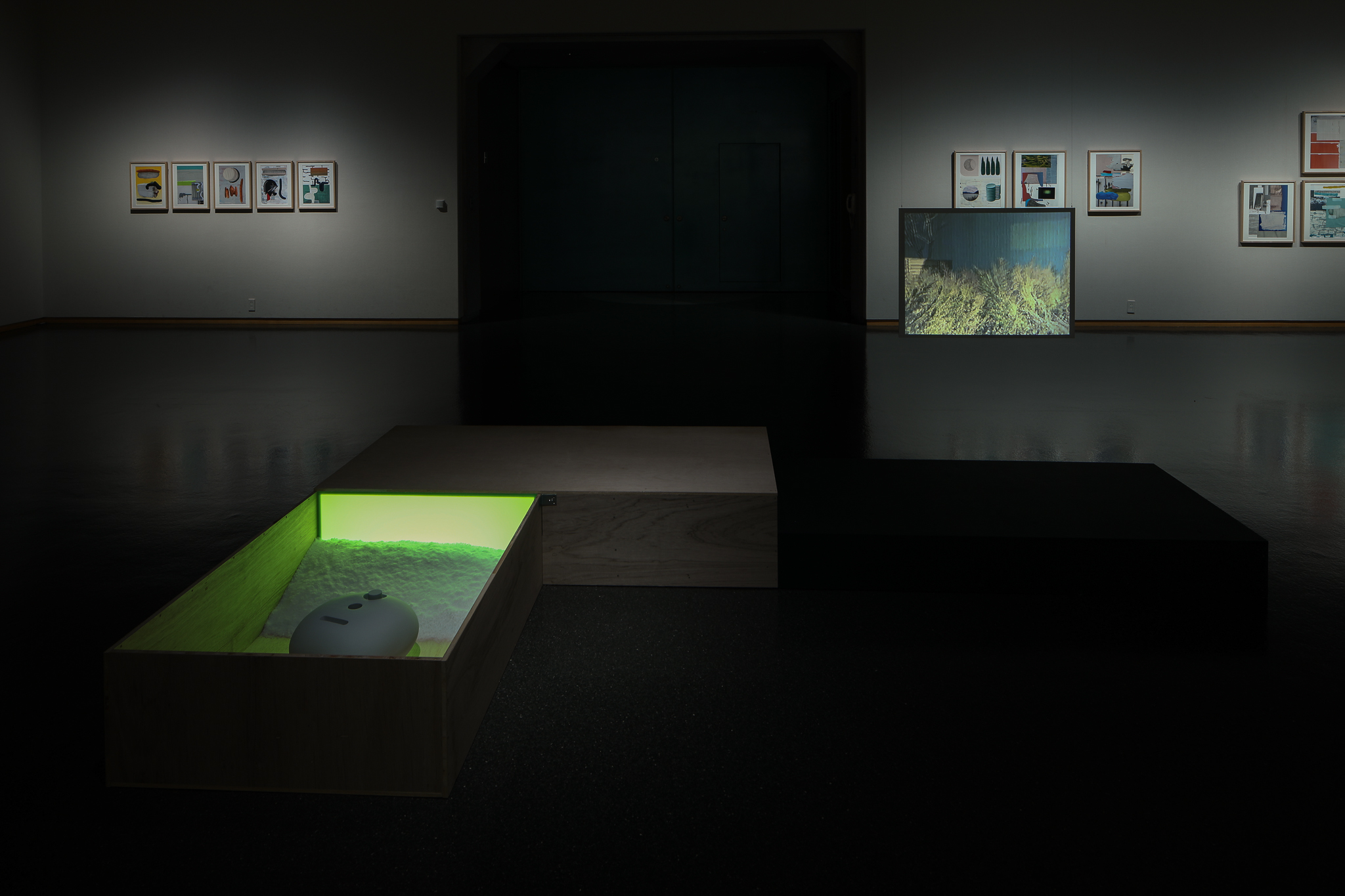 また、展示会場の中央部には、福島市内の「空き地」を8mmフィルムで撮影した映像と共に、鑑賞者が座ることができる台座を設置。都市と自然との間、また公共空間と住宅の間で形成される都市の隙間のような場所が、植物や生物、モノなどの避難所となっているという「第三風景」(ジル・クレマン)のコンセプトと照らし合わせながら、美術館内に新たな「空き地」のシミュレーションを作り上げました。作品が、鑑賞者の経験や、彼らが暮らす地域と緩やかに結びつき、開かれていく作品のあり方を今回の展示において作り上げることができたように感じています。
